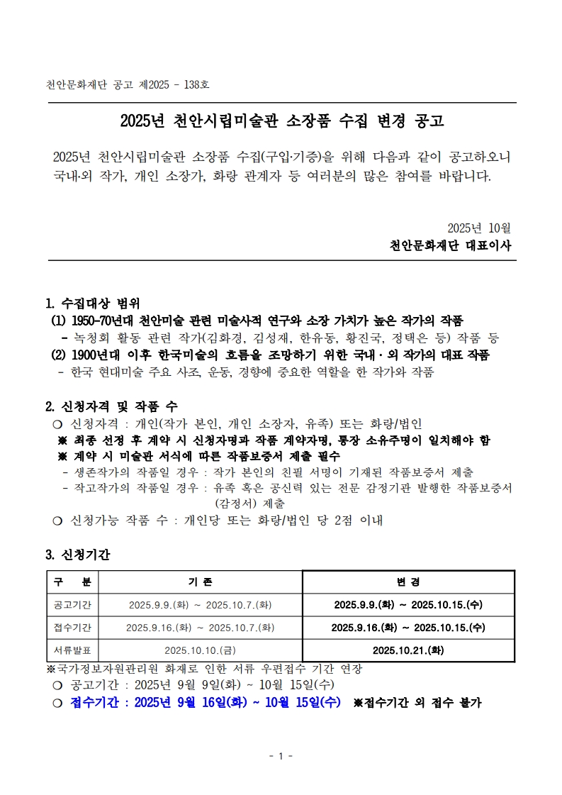 (제2025-138호) 2025 천안시립미술관 소장품 수집 변경 공고